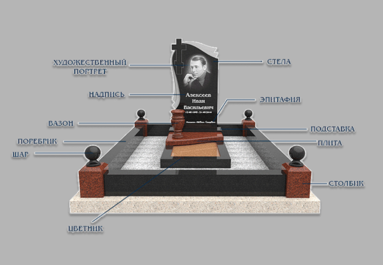 Мемориальные комплексы - это единая архитектурная композиция из гранитных изделий, включающая в себя ряд декоративных элементов, например: поребрик, надгробие, скамья, плитка, вазы и т. д.